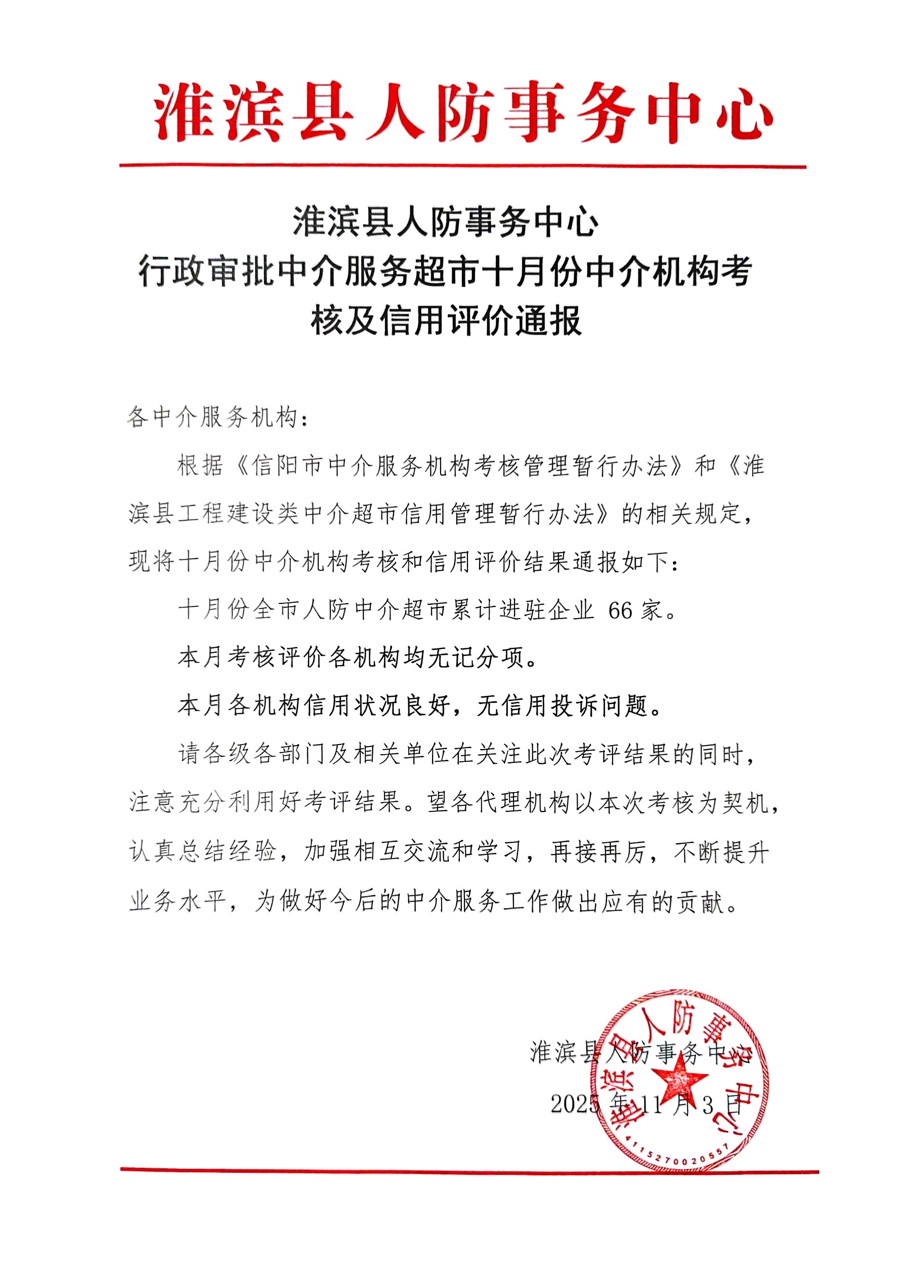 淮滨县人防事务中心2025年10月人防行业中介超市考评情况通报
