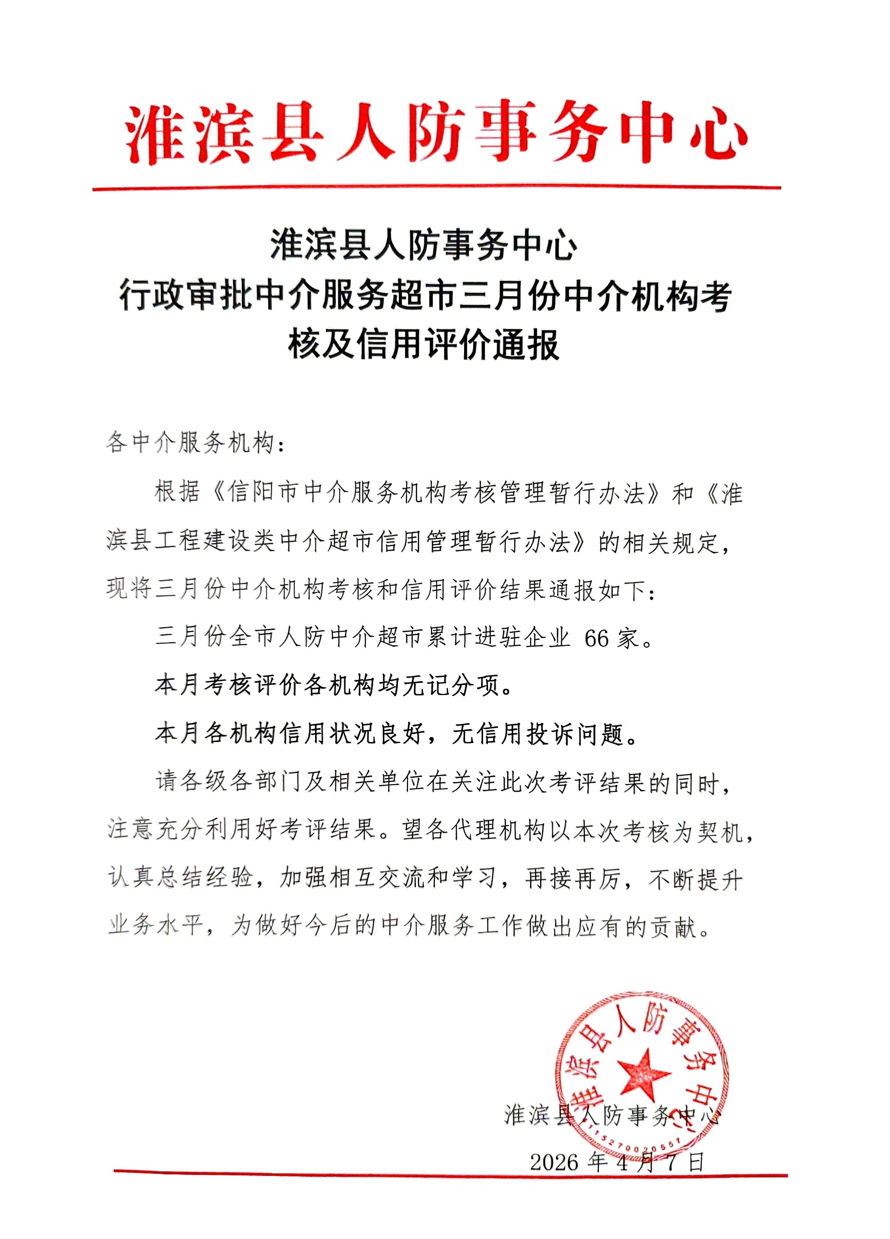 淮滨县人防事务中心2026年3月人防行业中介超市考评情况通报